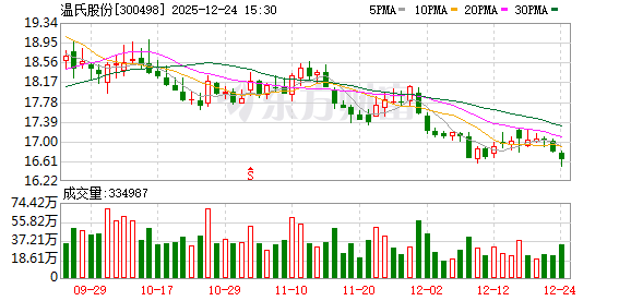 证券时报·数据宝统计显示,温氏股份今日收盘价为16.63元,下跌1.01%,日换手率为0.56%,成交额为5.57亿元,全天主力资金净流出3315.30万元,近5日该股累计下跌2.41%,近5日资金合计净流出6769.98万元。